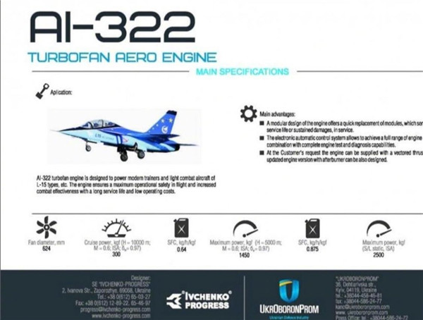 AI-322發(fā)動(dòng)機(jī)由烏克蘭“伊芙琴科-進(jìn)步”設(shè)計(jì)局研發(fā),由馬達(dá)西奇公司制造,這臺(tái)發(fā)動(dòng)機(jī)就是原來的AI-222-25發(fā)動(dòng)機(jī)的改進(jìn)型,是一種無加力的中小推力小涵道比渦扇發(fā)動(dòng)機(jī),它的無加力推力是2.5噸。AI-322還有一個(gè)帶有加力燃燒室的型號(hào),叫AI-322F,加力推力達(dá)到4.2噸,是為L-15的領(lǐng)先戰(zhàn)斗訓(xùn)練型L-15B研發(fā)的,L-15B具備1.4馬赫的超音速飛行能力,可以承擔(dān)輕型戰(zhàn)斗機(jī)的部分功能。